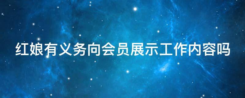 红娘没有义务向会员展示工作内容。红娘与古代的媒人职责是一样的,自提亲起,到订婚、促成结婚都会起着中间人的作用,在男女双方间有跑腿、联络、协调、细节调解、搞气氛、说吉祥话等作用,直至婚礼结束,并从中收取媒人费。而红娘更是一种职业,是专门针对高端客户群体,通过电话和面谈的方式,挖掘婚恋需求,引导其加入VIP人工服务,并制订与之匹配的婚恋方案。总之,红娘应本着服务他人、达成婚姻愿望为出发点,适时调解两人恋爱中的矛盾,让男女双方更顺利地进入婚恋状态。而男女双方不管最终以何种心路历程步入婚姻殿堂,都要对红娘感激不尽。