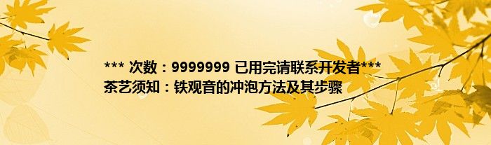 本文*** 次数:9999999 已用完请联系开发者*** 茶艺须知:铁观音的冲泡方法及其步骤到此分享完毕,希望对大家有所帮助。