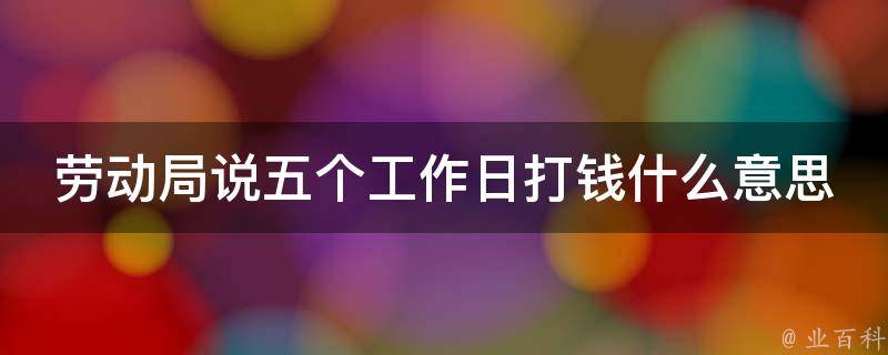 劳动局说五个工作日打钱,意思是劳动局会在五个工作日内将钱打给相关人员或企业。具体打款时间会受到多个因素影响,包括但不限于申请材料的完整性、审批流程的进度、银行转账的时间等。因此,实际打款时间可能会提前或延后。