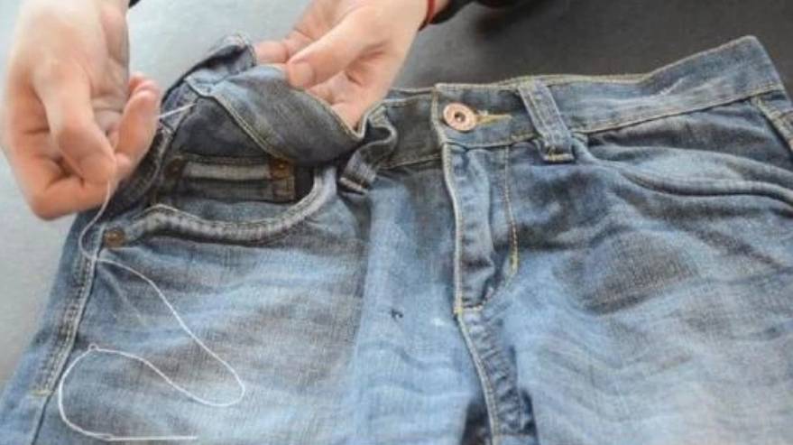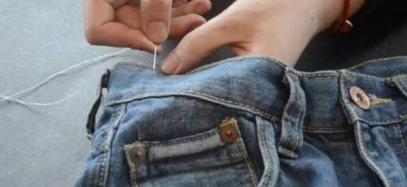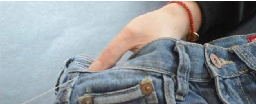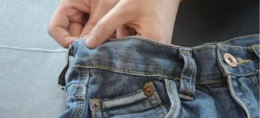 最后,收尾针需要将针线沿着裤子中间线由外向内,再由内向外一戳即可。这是只需要再用力拉一拉缝线,刚才缝纫的针线就会被隐藏起来,裤腰也会变小。