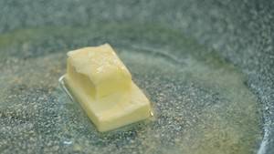 3、把黄油放入不粘锅里,小火慢慢融化,轻轻晃动不粘锅,让黄油铺满锅底。