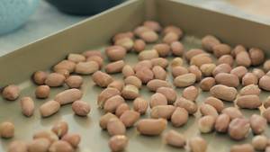 2、将生花生倒入烤盘中铺匀,放入烤箱,上下火120度烤15分钟,烤好的花生稍微凉一下,去皮待用。