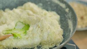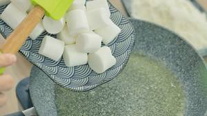 4、下入棉花糖,用硅胶材质的刮刀轻轻压拌,让棉花糖慢慢融化。