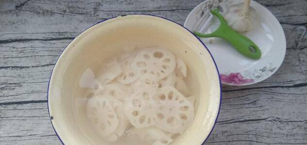 2、莲藕去皮切成片,用清水洗去淀粉。
