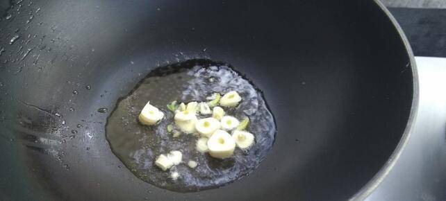 3、锅里倒入适量油,爆香蒜片。