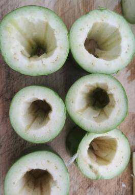 3、把茄子中间用勺子或者其他工具挖空,挖出来的茄子肉不要扔,可以放在一起烧。