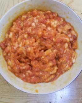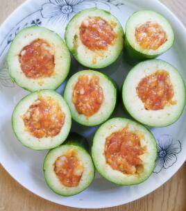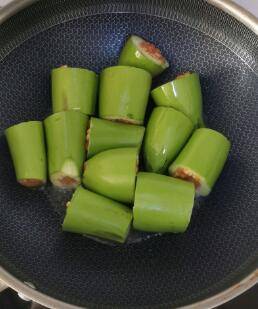 4、把调好的肉馅填到茄子中间去,要把肉塞紧塞满,要不然下锅的时候容易掉出来。