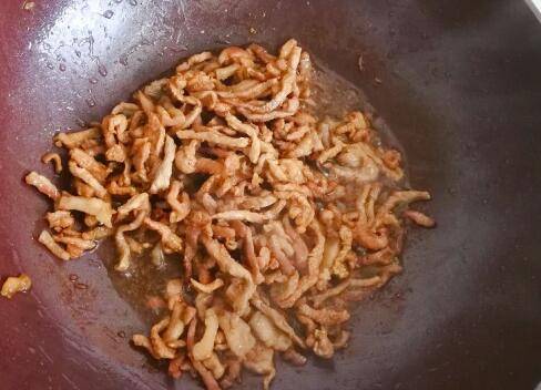 2、锅里放入油烧热,放入肉丝翻炒均匀,继续翻炒到肉丝微微卷起来。
