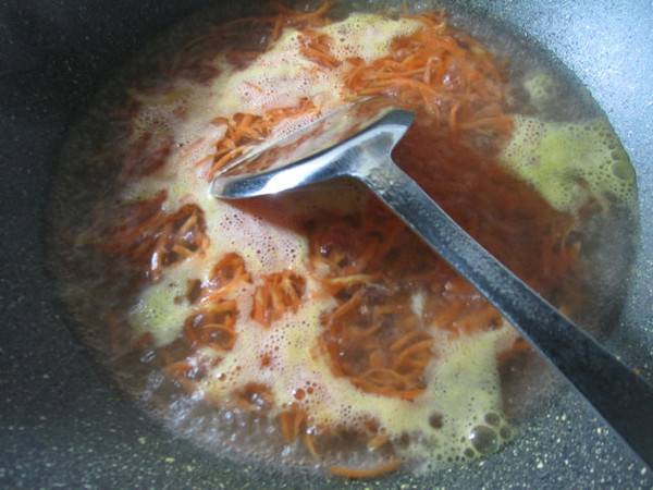 3、将胡萝卜丝下入清水锅中焯开捞出。