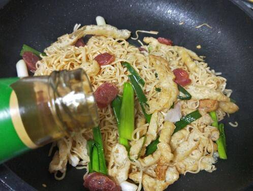4、然后放入面条,腊肠继续翻炒。