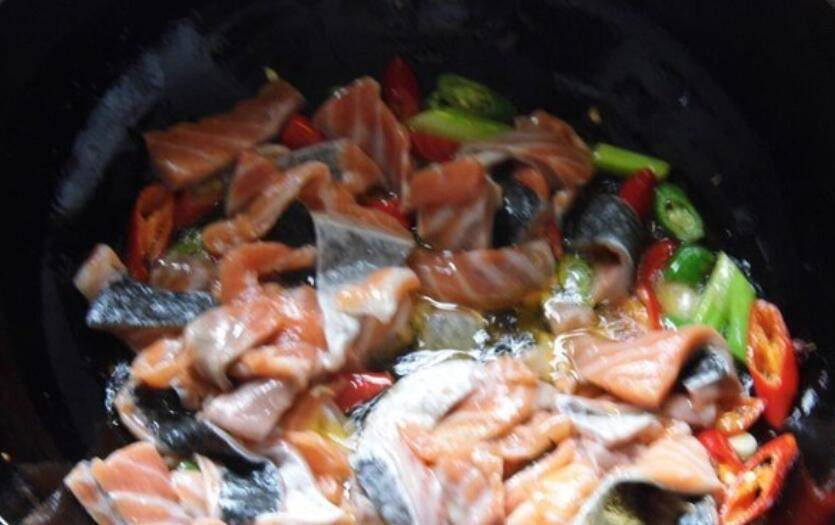 主料:三文鱼250克、大葱1根、盐1茶匙、鸡蛋清1个、黑胡椒1茶匙、生抽1茶匙、大蒜3瓣、柠檬汁1茶匙、青红尖椒4个、植物油3汤匙。