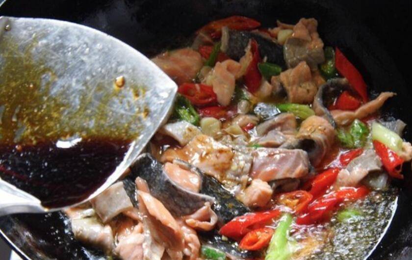 7、翻炒几下,加入生抽。