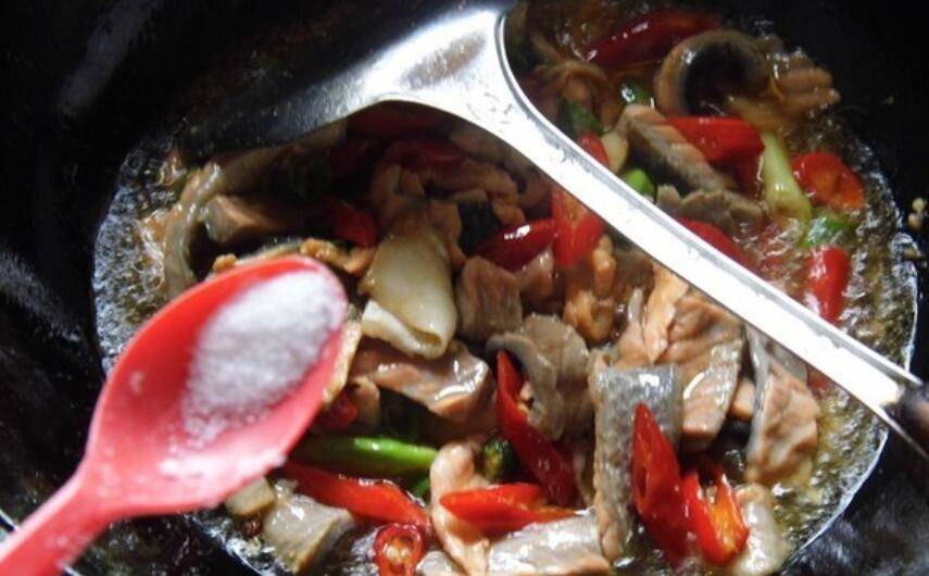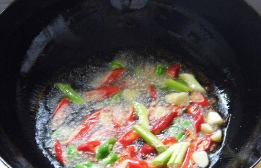 5、油热后爆香尖椒、葱、蒜。