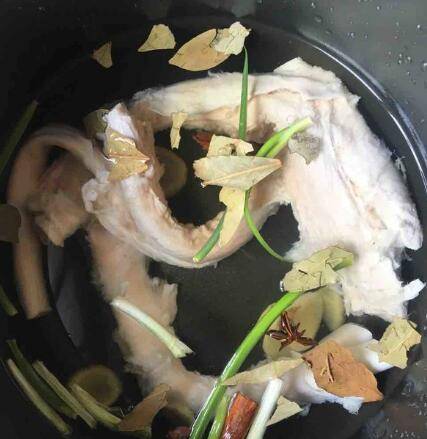 牛蹄筋洗净后倒入电饭煲内胆中,继续放入生姜片、香叶、八角、桂皮、2勺料酒。