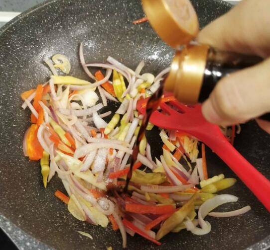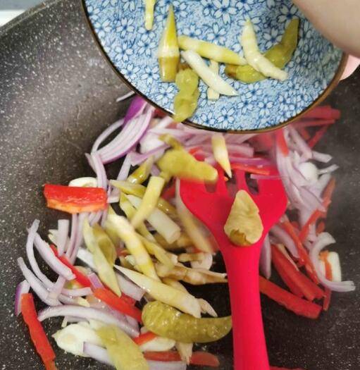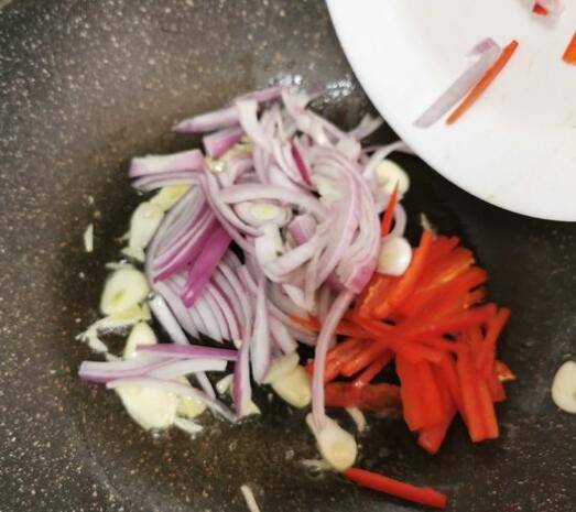 3、倒入洋葱红椒丝,快速翻炒均匀。