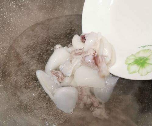 1、水开倒入清洗干净的墨鱼仔,稍微缩水即刻捞出控水备用。