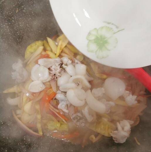 6、倒入墨鱼仔快速翻炒均匀,撒上少许白糖提鲜,盛出即可食用。
