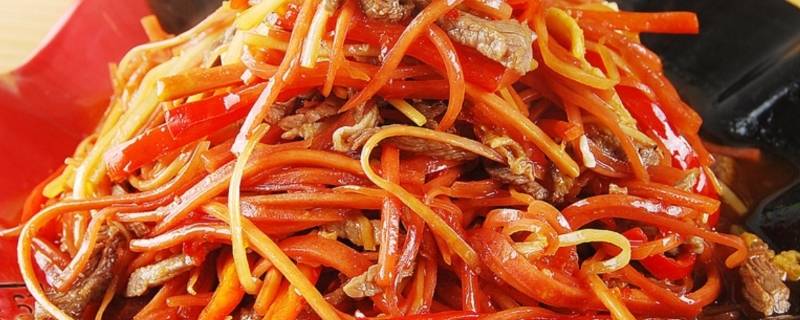 酱牛肉200克、胡萝卜1个、洋葱1个、青辣椒1个、生抽2勺、蚝油1勺、盐适量。