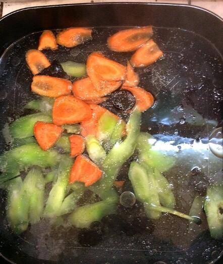 4、热锅放油,放入葱白和蒜片小火煸出香味。