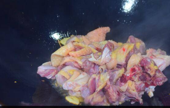 4、将鸡肉清洗干净之后,剁成均匀大小的小块,装盘备用,再起锅加油烧热,放入姜片炒几下,然后迅速将鸡肉放入锅中,快速地爆炒,柴火灶要注意掌握生熟度,不然容易炒糊了。