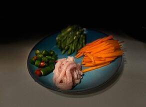 肉、胡萝卜、四季豆、辣椒切丝切丁备用。