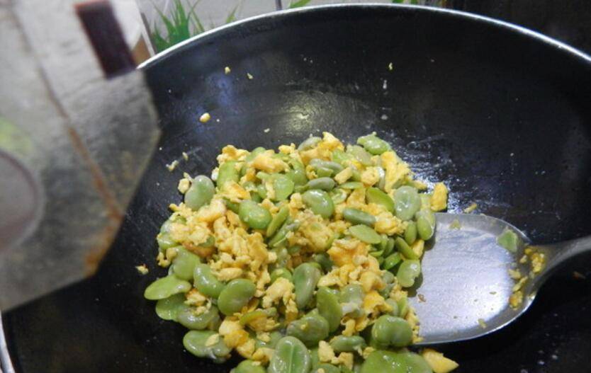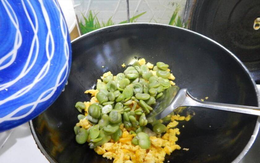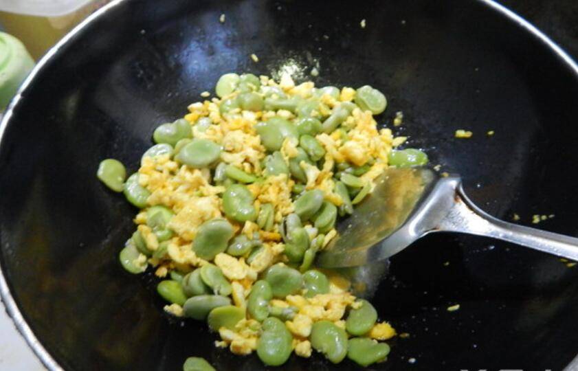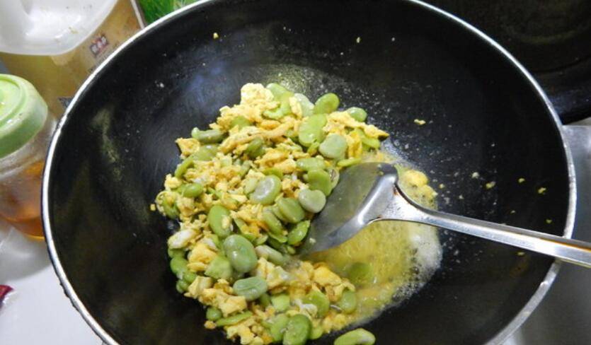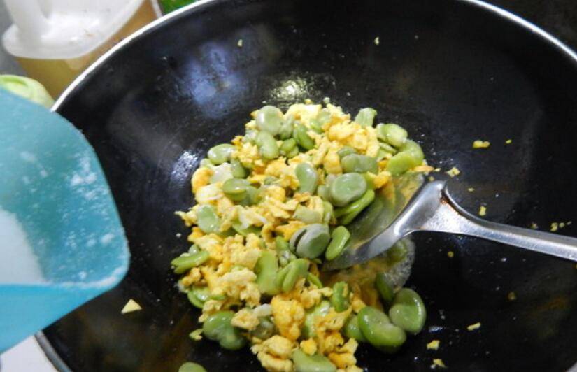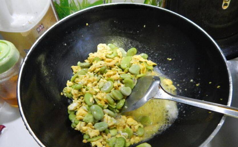 5、然后加入蚕豆炒。