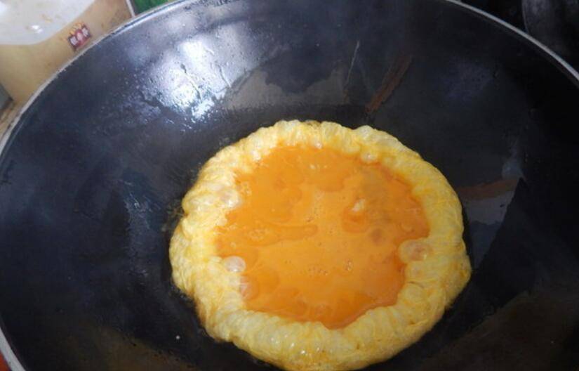 3、鸡蛋打散倒入锅里。