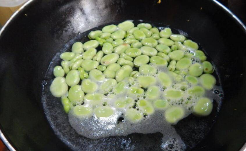 2、烧开后加入蚕豆下锅煮。