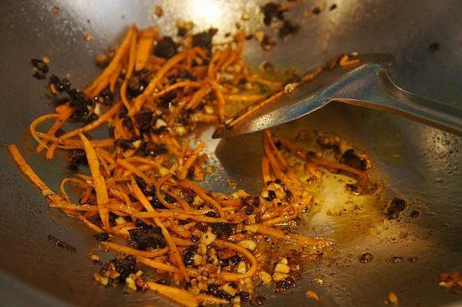 5、炒锅中加入适量的油,爆香花椒粒,然后爆香豆瓣酱,加入胡萝卜丝煸炒。