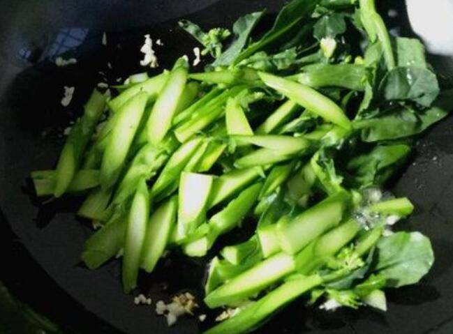 5、大蒜爆香到微黄后,先把切好的芥兰杆下锅,加大火力翻炒约2-3分钟。