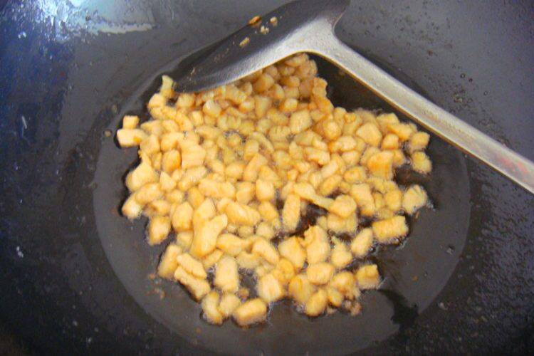 5、锅内下油,要多些,将腌好的鸡丁入内炸。