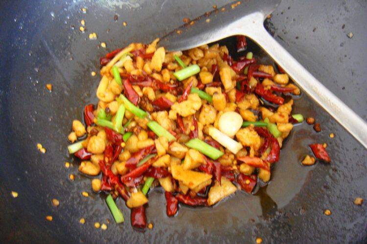 8、锅内留底油,净姜蒜辣椒花椒入内爆香。