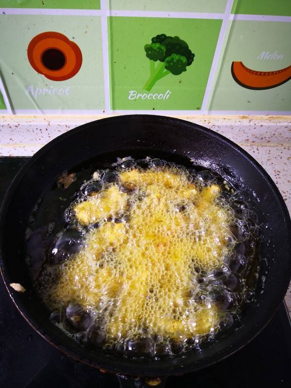 5、将豆油烧至六成热放入牛肉条,中火炸至两面金黄即可。