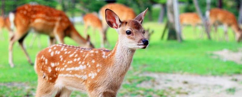 梅花鹿。因梅花鹿身上有着密密麻麻的斑点。梅花鹿是一种中小型鹿,体长125至145厘米,尾长12至13厘米,肩高70至95厘米,体重70至100千克。毛色夏季为栗红色,有许多白斑,状似梅花;冬季为烟褐色,白斑不显著。颈部有鬣毛。雄性角长达30至66厘米。梅花鹿群居性不强,雄鹿往往是独自生活,活动时间集中在早晨和黄昏,生活区域随着季节的变化而改变,春季多在半阴坡,夏秋季迁到阴坡的林缘地带,冬季则喜欢在温暖的阳坡,主要以草、水果、草本植物、树芽、树、农作物为食。种群主要分布在俄罗斯东部、日本和中国。是中国国家一级保护动物。