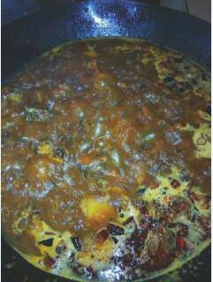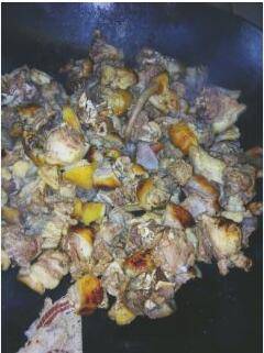 起锅烧油,加入花椒、辣椒、草果、麻辣酱、桂皮、大蒜、大葱,爆出香味后加入竹鼠翻炒均匀;