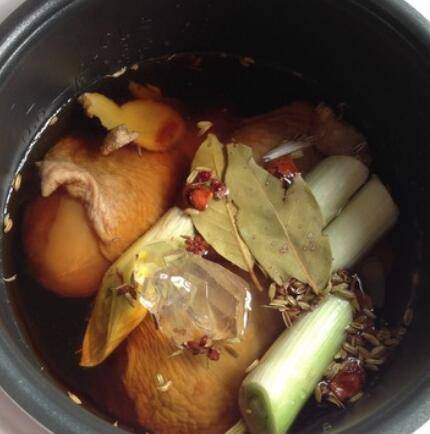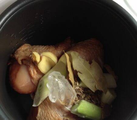 3、放入电饭煲内胆,加入姜片、香料、冰糖、盐、料酒。