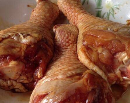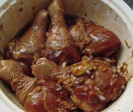 2、琵琶腿洗净控水,加白糖、老抽、盐、料酒用手抓匀入味。