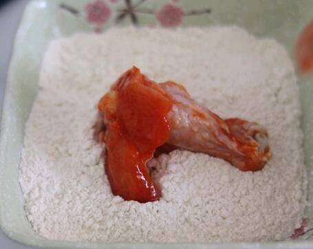 3、腌制好的琵琶腿,放入炸鸡裹粉里,第一次裹粉。