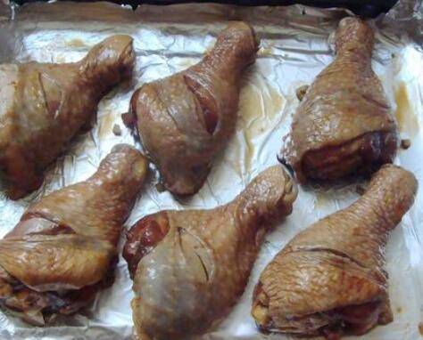 4、烤盘里面铺锡纸,把腌制好的鸡腿摆放在上面。