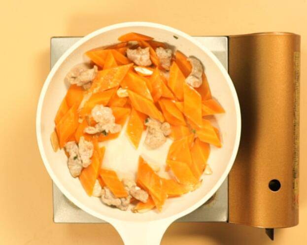 最佳答案用料:胡萝卜1根、猪肉30克、葱花5克、蒜片8克、姜片5克、盐3克、食用油5毫升、生抽3克、胡椒粉2克。1、准备胡萝卜去皮切片,葱花、姜末、蒜片、猪肉切片。2、碗中放入猪肉、盐搅拌均匀。3、起锅清水煮沸倒入胡萝卜,焯水30秒。4、起锅倒入油5毫升,倒入葱姜蒜,倒入肉片,煸炒至变色倒入胡萝卜,翻...
