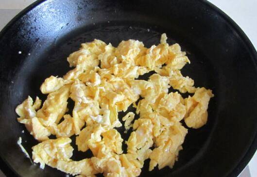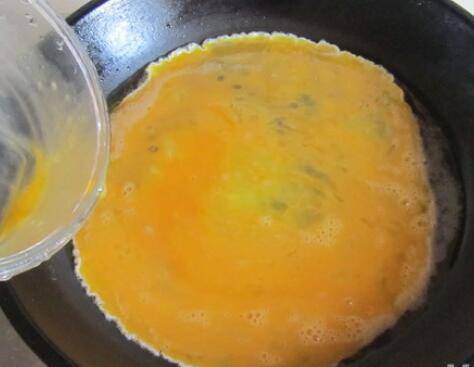 蛋打入碗中,加入适量的盐和1勺料酒打散;热锅凉油,倒入蛋液,煎至定型。
