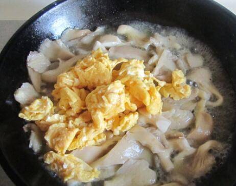 翻炒至平菇微微发软后加入适量的盐翻炒均匀;倒入刚刚炒好的蛋块,翻炒均匀即可。