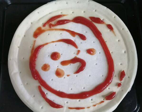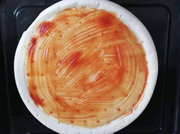 3、均匀的挤上番茄酱,用小刷子刷匀,边边的地方不要涂到。