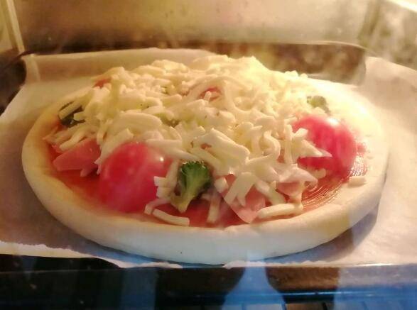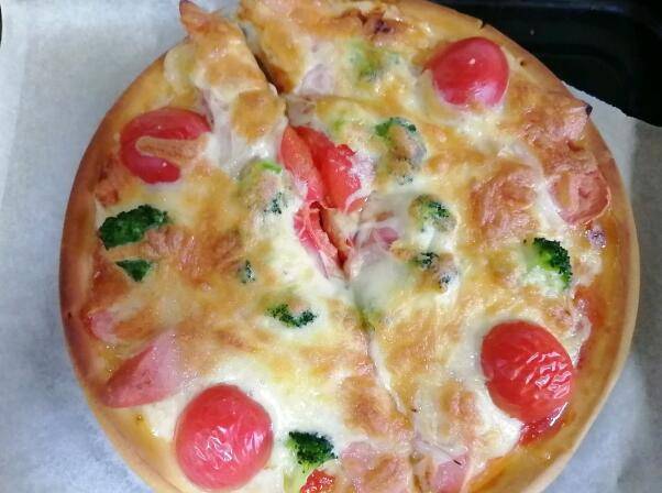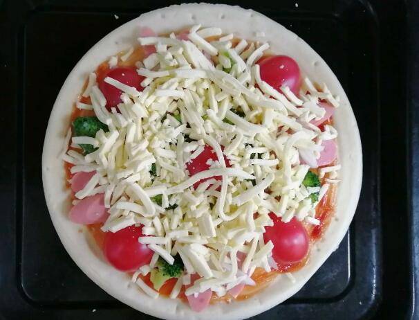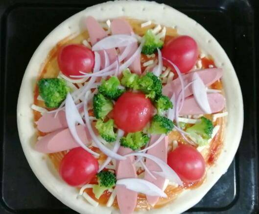 用料:披萨皮、小西红柿3个、西兰花3小朵、番茄酱30克、马苏里拉芝士100克、洋葱适量。