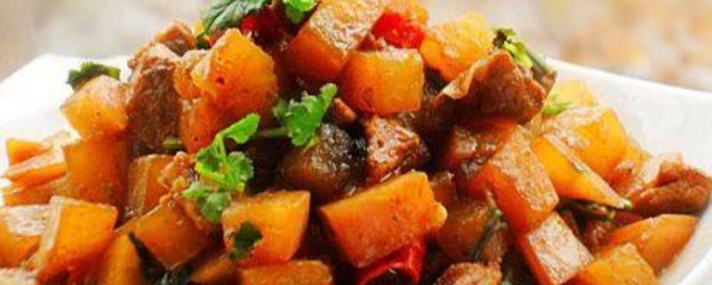 6、放入萝卜丁加盐翻炒片刻,加小半碗水炖一下。