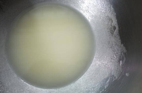 打蛋盆里倒入水和色拉油,用手动打蛋器搅拌至充分乳化。