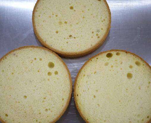 烤好的蛋糕取出,放在晾网上晾凉,然后脱模,把蛋糕平均分成3片。