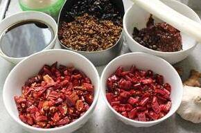 干辣椒圈、豆瓣酱、豆豉、干花椒、蒜瓣、老姜、葱白、盐、碎冰糖、高度白酒、综合香料(八角、桂皮、香叶、三奈、小茴香、丁香、草果、肉蔻、白寇等)。