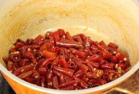 加入粗辣椒面、香料碎、泡好的花椒慢慢熬干水分;加入葱、姜、蒜熬至金黄,表面微干。