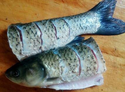 1、将清理后的草鱼切成两段。